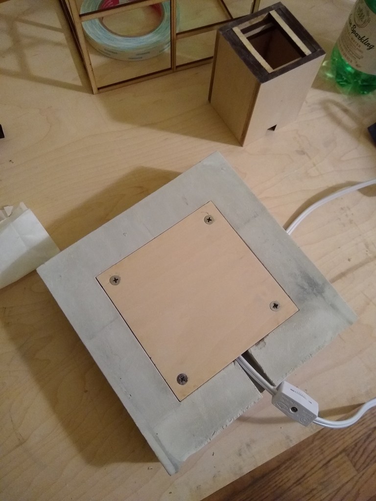 A simple, elegant wooden framework forms the lamps shade structure while a solid concrete base grounds the lamp. The removable wooden stem in the center pierces the concrete to provide a base for the light – this design encouraged experimenting with cast bolts for attachment. Below are some photos of the finished lamp + a collection of process photos.