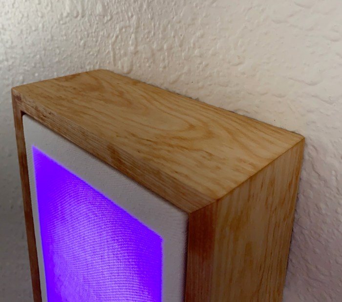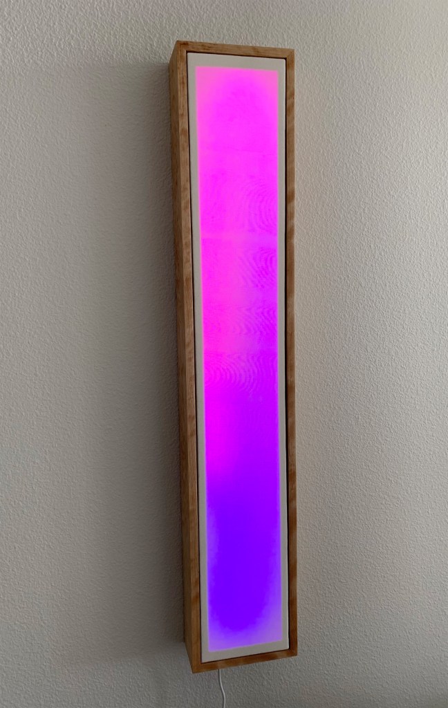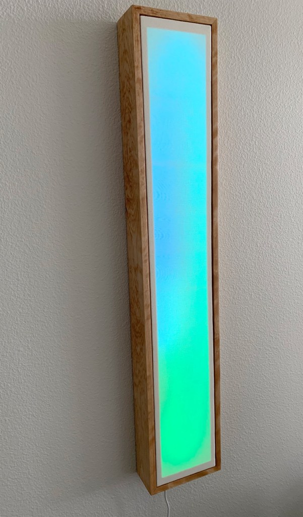 The pdx light box was the result of numerous conversations and ideas shared between me and the client. It functions as an interactive lamp – changing colors, effects, and even synchronizing with music through a phone app. The light box, which is about 34″ tall (or long), mounts to the wall in two positions – vertical (shown) and horizontal – using french cleats.