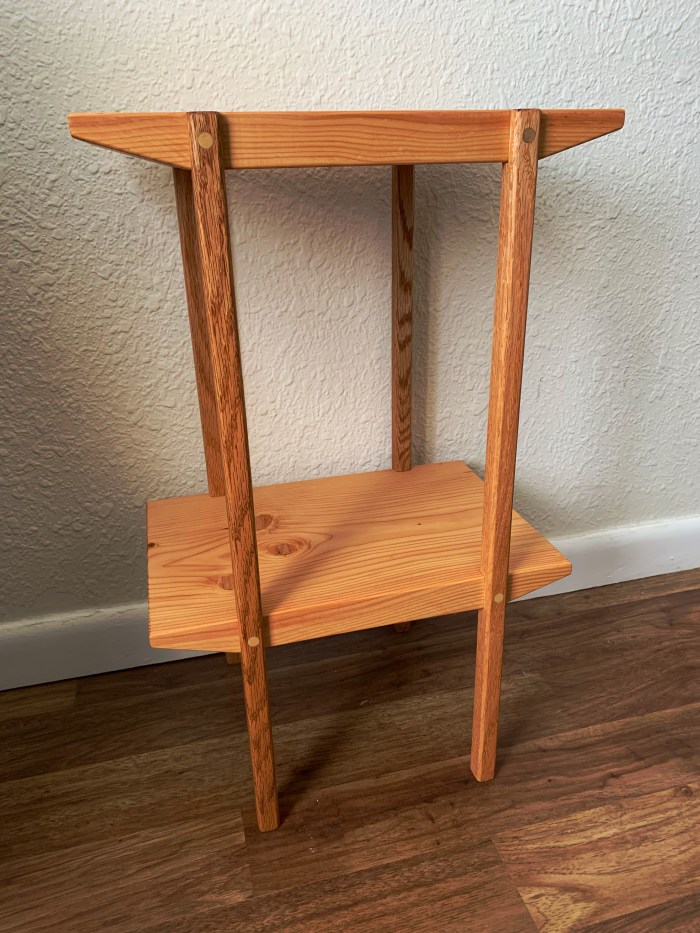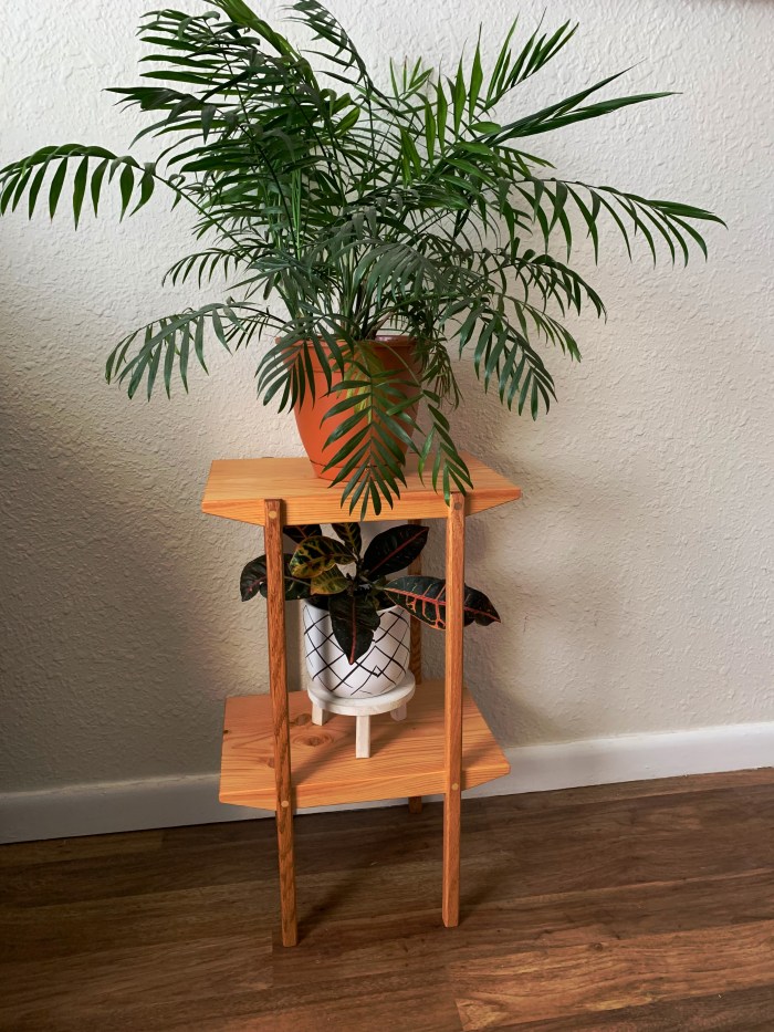 A simple plant stand made from salvaged | gifted materials. Wooden dowels provide additional support and visually tie the shelves to the legs.